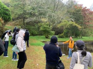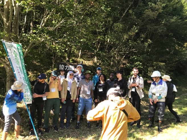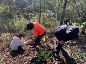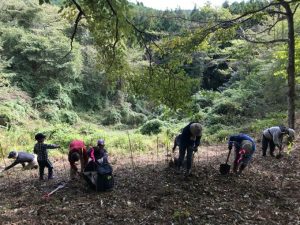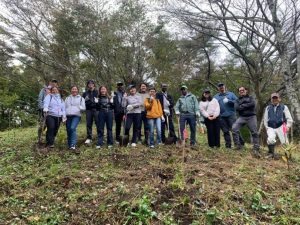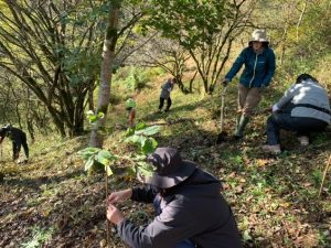 2025年10月25日(土)JICA研修員やOVら17人が参加して、ブナ、ミズナラ、クヌギ、トチノキ、エゴノキ、キハダ、カシワ、ヤマボウシの植林を行った。JICA研修員の方々も、日本の情報には熟知しており、この地域ではクマによる被害情報はないか、クマが生息していないかとの質問も受けた。確かに隣町で出没情報もあったが、今はそうした情報も聞かないので安心して植樹をと伝えると、安心した表情を見せた。植林後に近くの釣り堀センターで焼き魚による懇親会も行われ舌鼓を打った。また、11月1-2日(土・日)にはOVやその家族や関係者17人が集いブナ、ミズナラなどの落葉広葉樹種を植え、11月1日(土)の晩にはケータリングを持ち込んで懇親会も行われ、大いに盛り上がった。今年度の植樹活動には、延べ約50人以上の参加者があり、多くの苗木が植えられた。